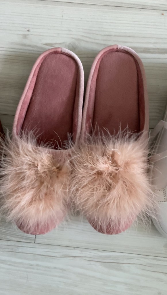 Finally, I ordered some shoes to wear around the house. Ever since I saw the Barbie movie, I’ve wanted to find some really fun bedroom slippers. I like that this pair from Amazon comes in a mauve, velvet-inspired fabric and a feather pom-pom at the top. These are great!